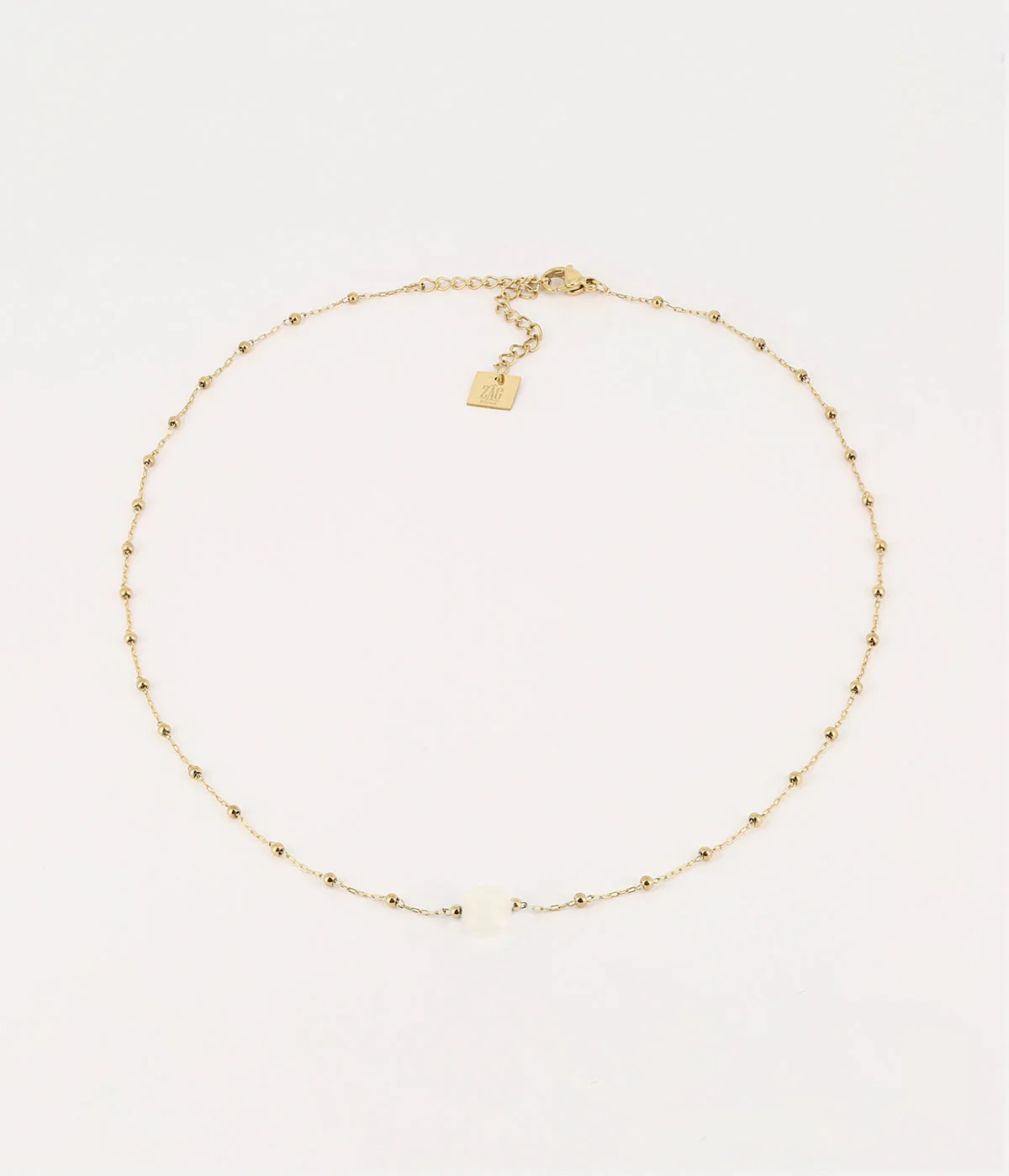 Collier chaîne “chapelet” en acier doré à l’or fin sur lequel est attachée une pierre naturelle.